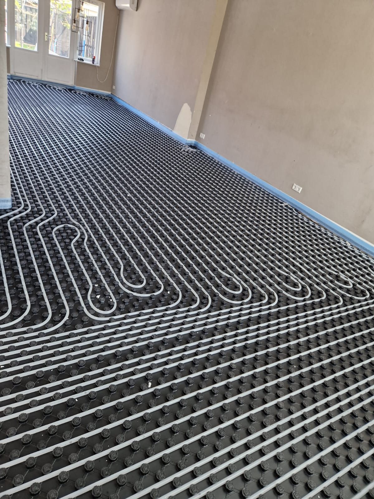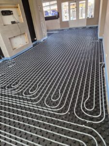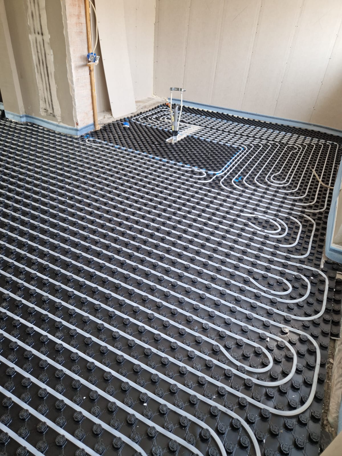 Met de isolerende laag van schuimbeton op zijn plaats, zijn we verder gegaan met de installatie van vloerverwarming. Vloerverwarming is een populaire keuze in moderne huizen vanwege de gelijkmatige warmteverdeling en het verhoogde comfort. Voor dit project hebben we gekozen voor een systeem dat compatibel is met een hybride warmtepomp.