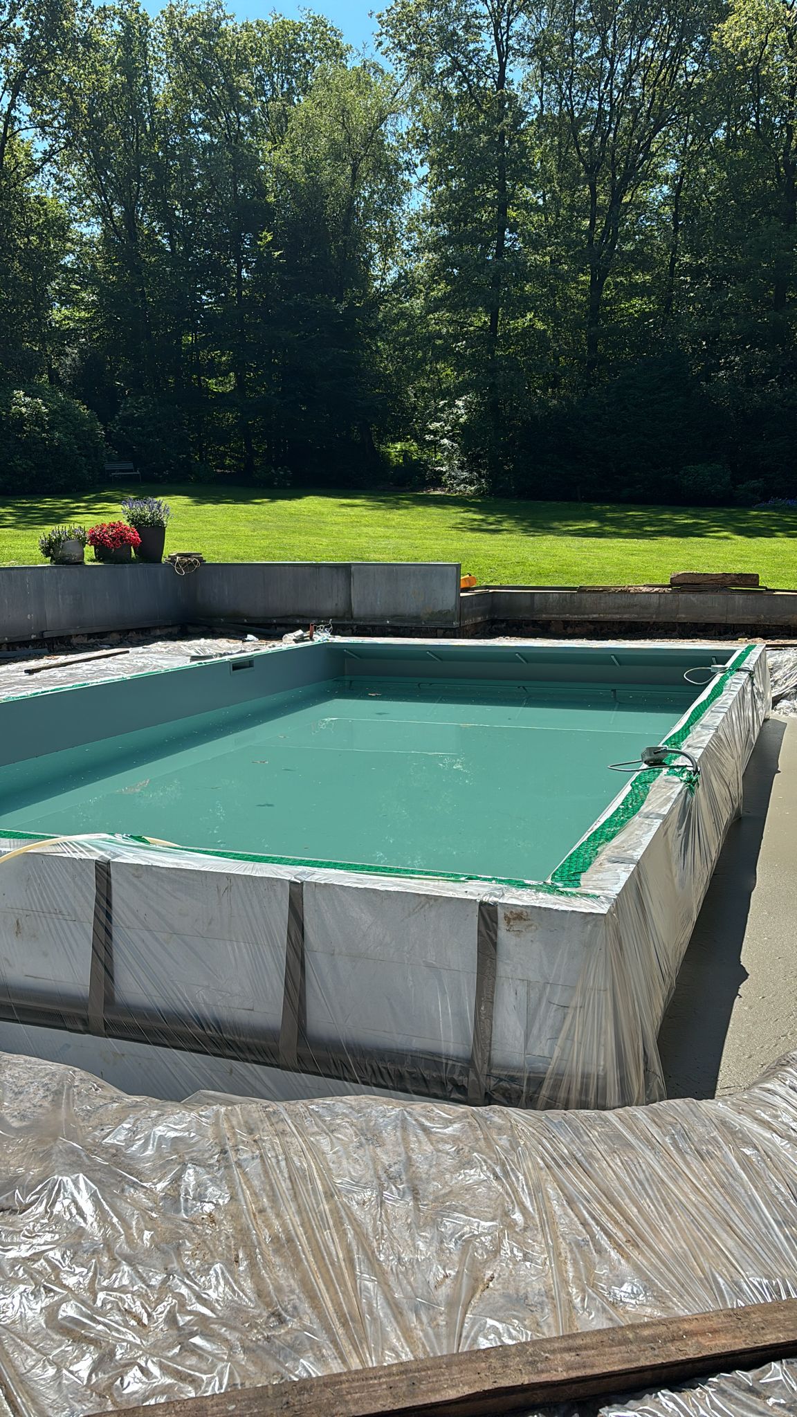 - Plaatsing van folie: Rondom het zwembad werd een folie geplaatst om de vorm en dikte van de schuimbetonlaag te bepalen. Deze folie zorgde ervoor dat het schuimbeton precies op de juiste plekken werd aangebracht.